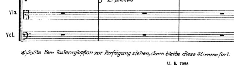 Se ve claramente que todas las líneas del primer pasaje están dobladas a la octava, lo que ya nos da alguna pista de por dónde van los tiros. El segundo fragmento presenta acordes placados de tres notas, lo que también nos da pistas. Efectivamente, Bartók escribió para un xilófono de teclado y así lo indicó en la partitura de dirección: