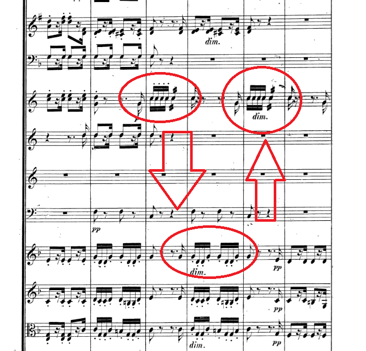 Como veis, el tema está claro, y SIEMPRE que aparece es con una anacrusa de semicorchea. El problema es que, en la primera intervención del timbal, que es exactamente el tema principal acompañando a los fagotes, trompas, violines I, chelos y contrabajos, somos el único instrumento que “rompe” la unidad temática y toca una anacrusa de corchea: