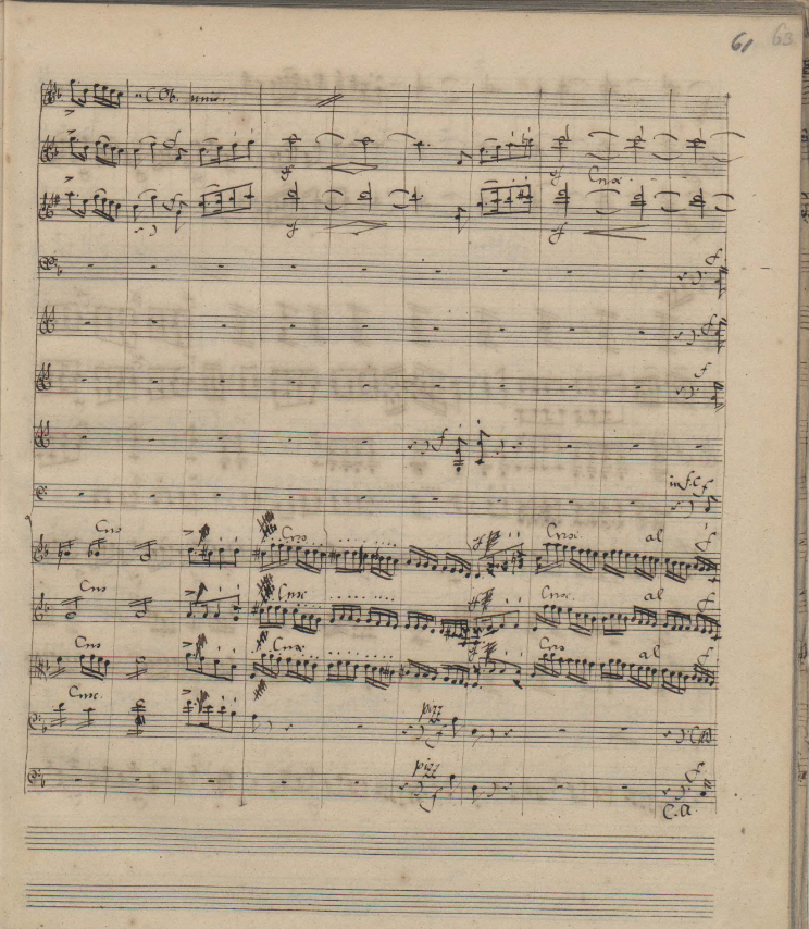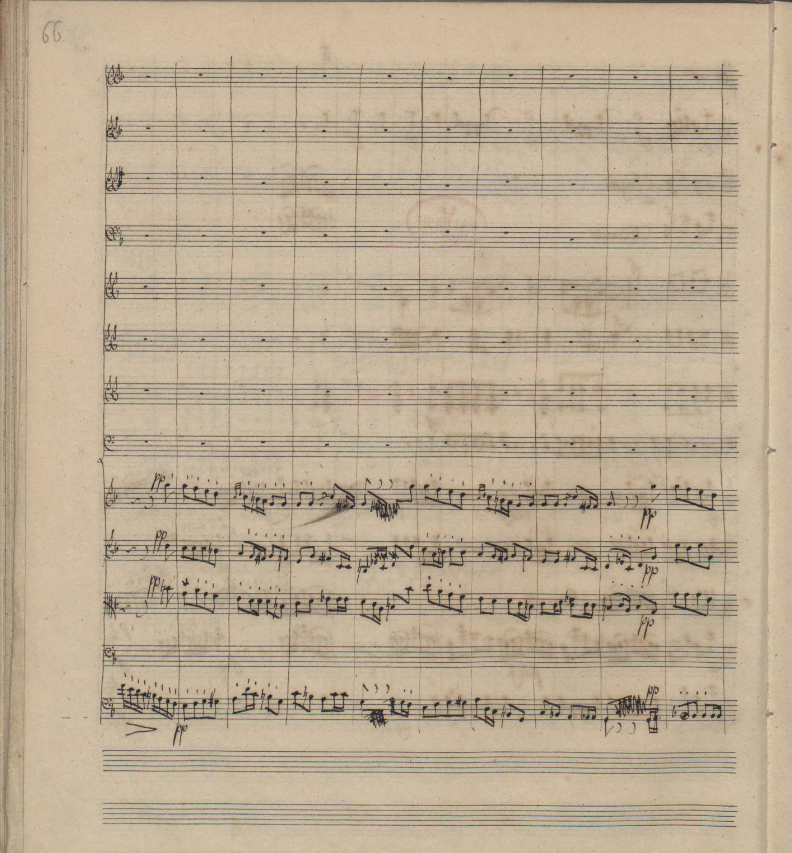 El problema es que el manuscrito original salta de la página 63 a la 66 (es decir, faltan la 64 y 65), con lo que es imposible ver qué pasa en toda la frase de 8 compases (sería muy útil ver qué ocurre al comienzo de la segunda semifrase, la anacrusa del quinto compás, pues es una repetición).