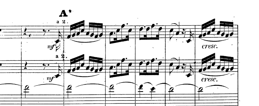 Esta frase es material temático y se va repitiendo a lo largo de todo el movimiento. Aquí en las flautas: