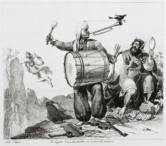 En esta caricatura que critica el uso excesivo de la percusión, se observa clarísimamente el uso de una mailloche en la mano derecha del ejecutante y de un rute en la izquierda, como era costumbre.